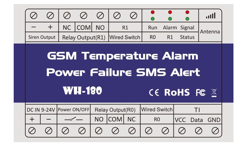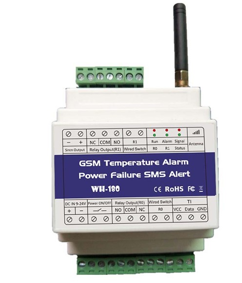 WH-180 GSM dojavljivač temperature, i nestanka struje. Koristi se u plastenicima, farmama, rashladnim komorama, kamionima hladnjačama, svugdje gdje je kritično održavanje temperature u zadanim granicama. U slučaju da temperatura izađe iz zadanih granica (npr. zaštita od smrzavanja u grijanim plastenicima za vrijeme zime) ili u slučaju nestanka struje (što može prouzročiti štetu jer su određeni uređaji prestali raditi) WH-180 će istog momenta uputiti poziv na telefon jedan ili više brojeva, te poslati SMS poruku o stanju temperature i električnog napajanja.